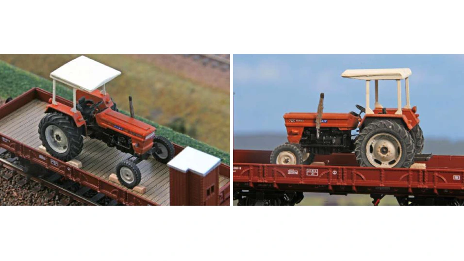 Carro pianale Tipo P con garitta delle FS Italia (FS) caricato con un trattore Fiat 750 Special, epoca III/IV.