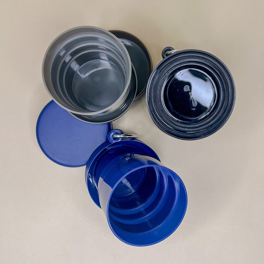 Bicchiere pieghevole richiudibile da campeggio in PP riciclato senza BPA con moschettone in metallo capacità di 220 ml.