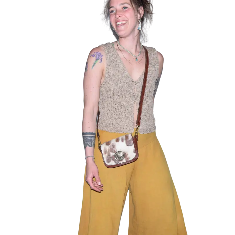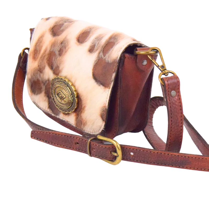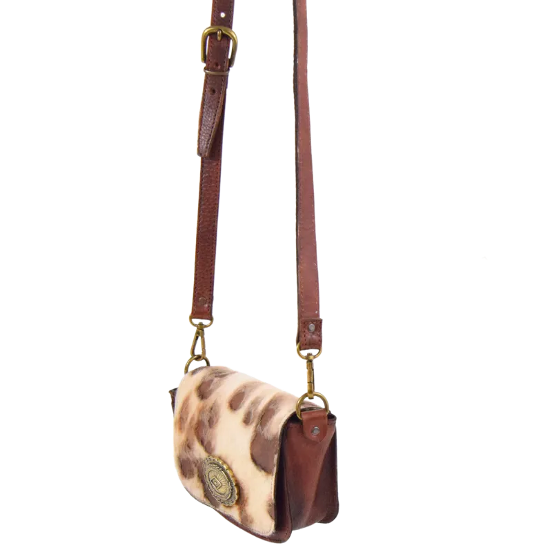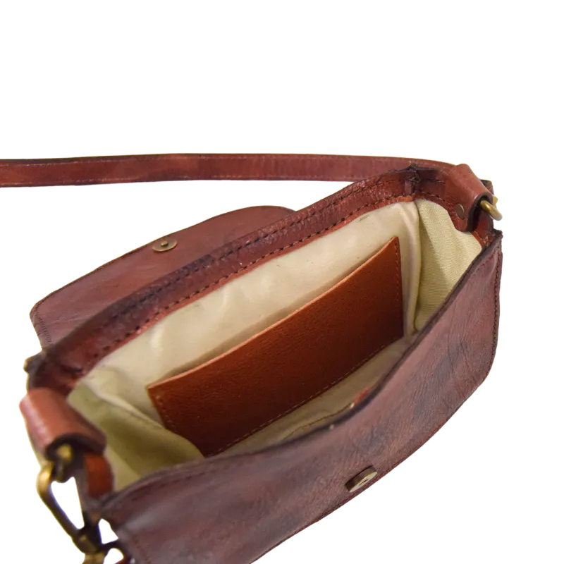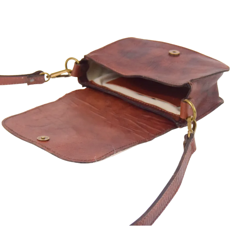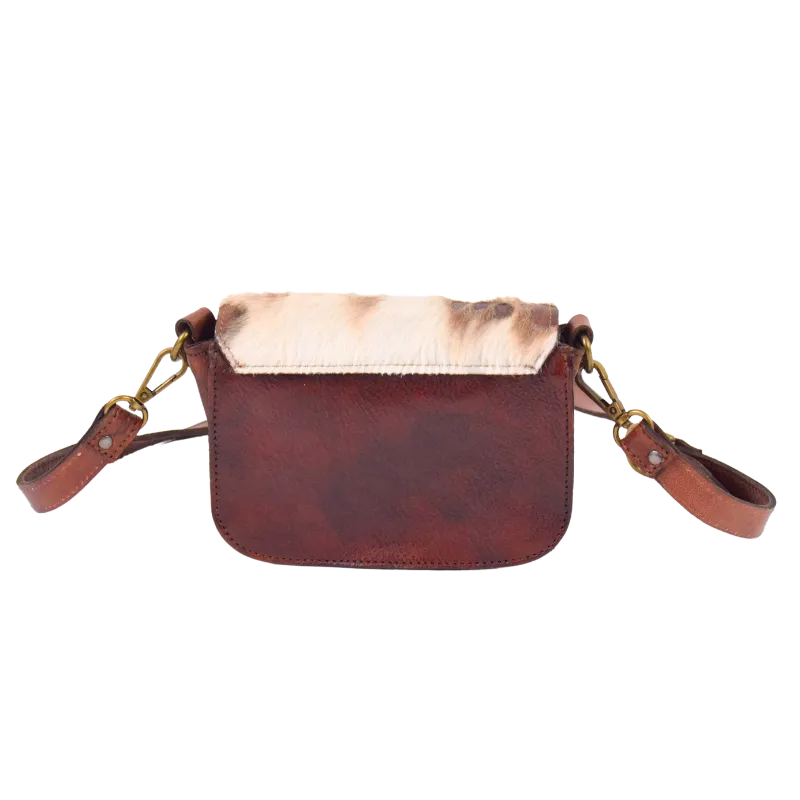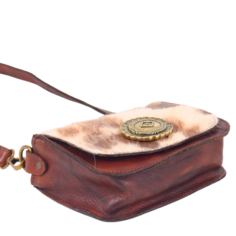 La borsa Taos Marri è realizzata in cuoio vacchetta tinta artigianalmente sui toni del marrone e cavallino dipinto a mano che rendono ogni pezzo unico in quanto le macchie di colore non saranno mai uguali le une alle altre.