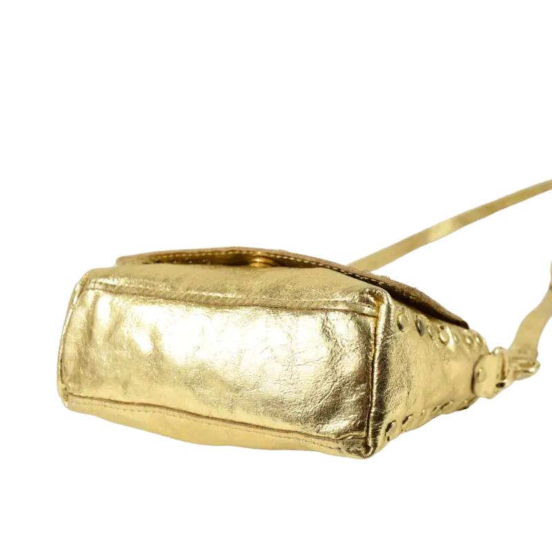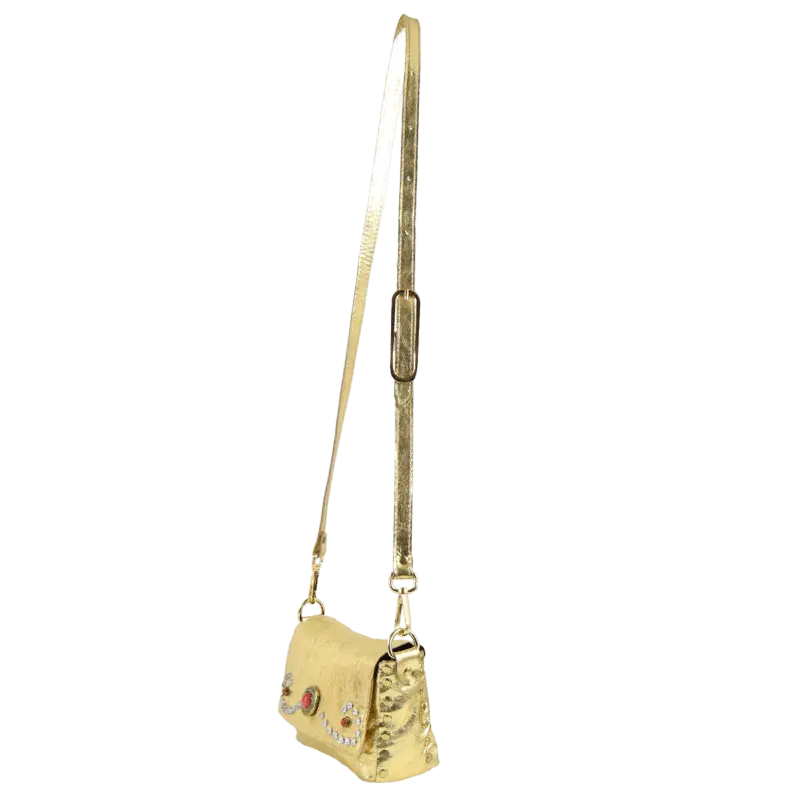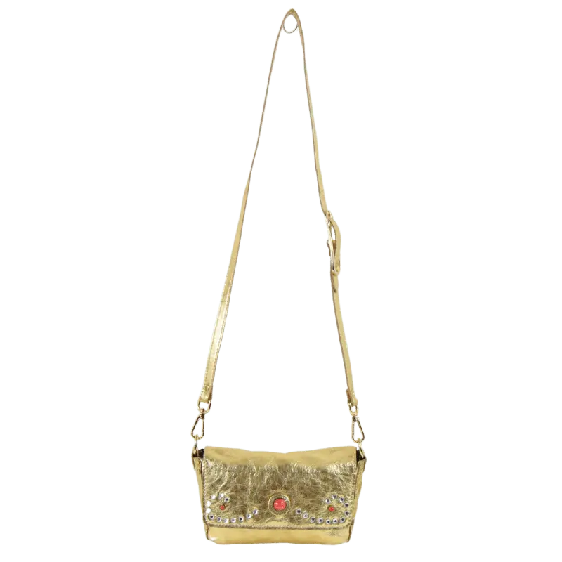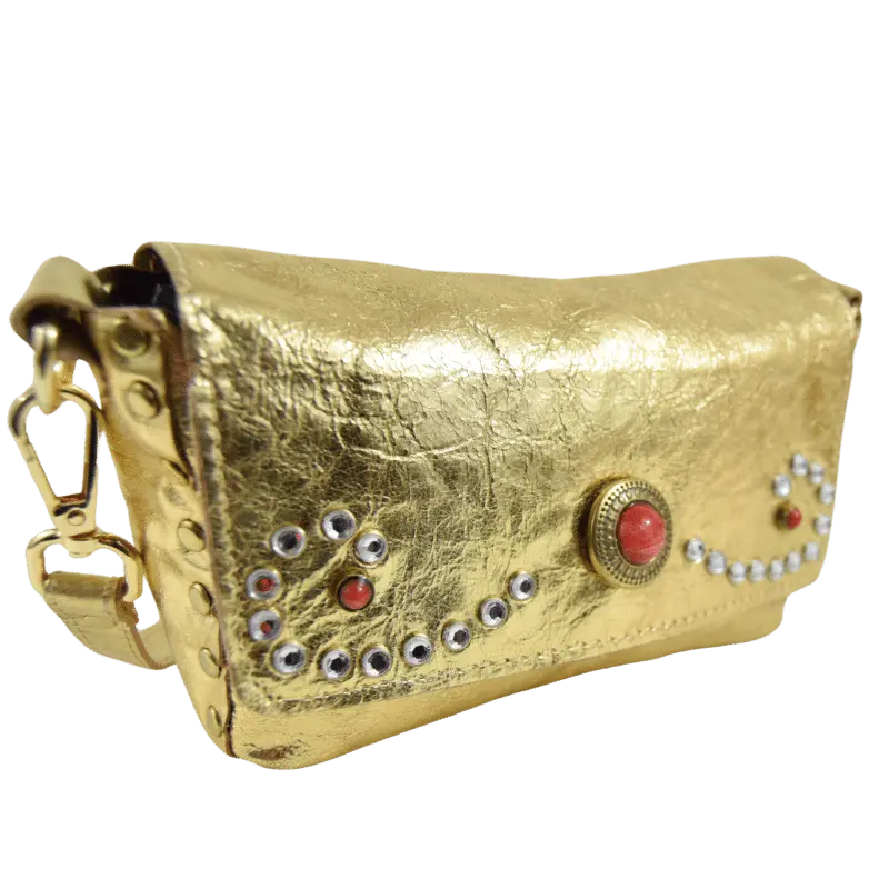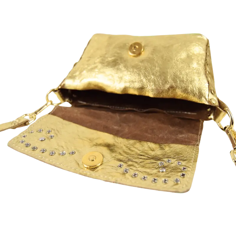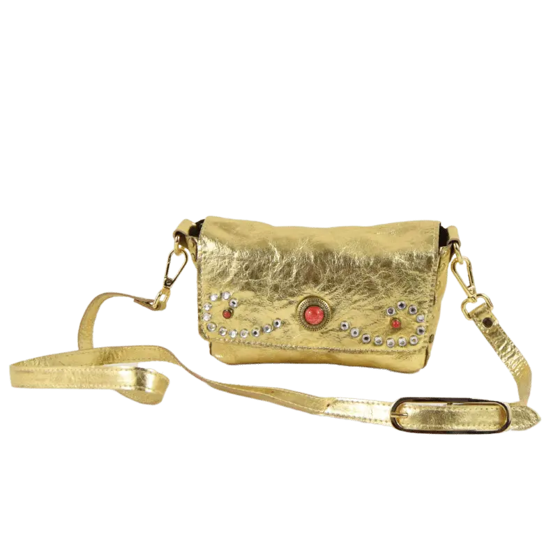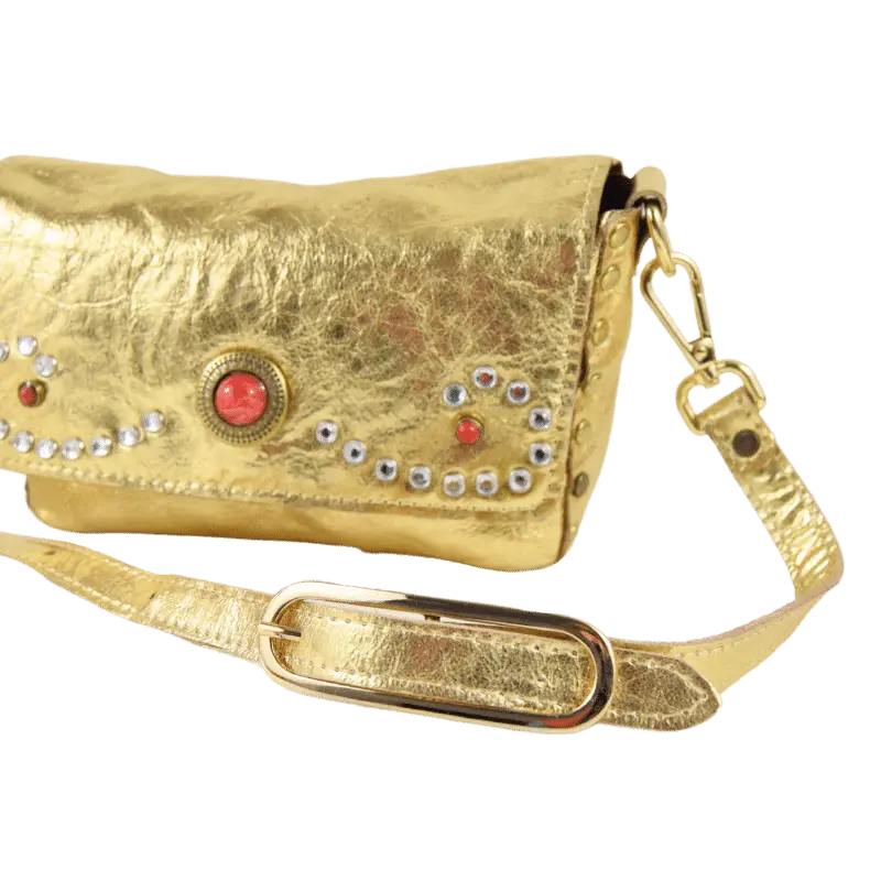 La borsetta Miki Corallo è realizzata in pelle laminata color oro.