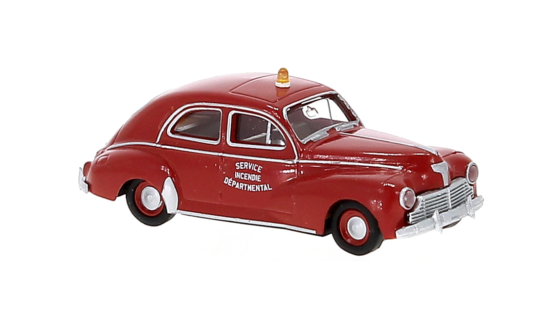 Peugeot 203 (1948) “Service Incendie Departmental”, colore rosso con luci ambra.