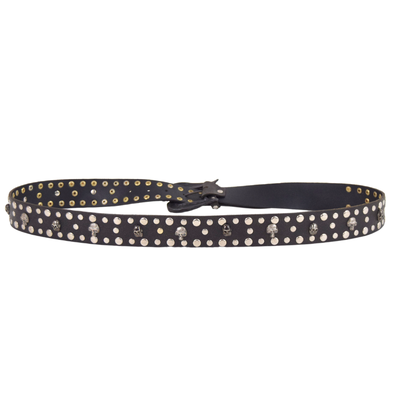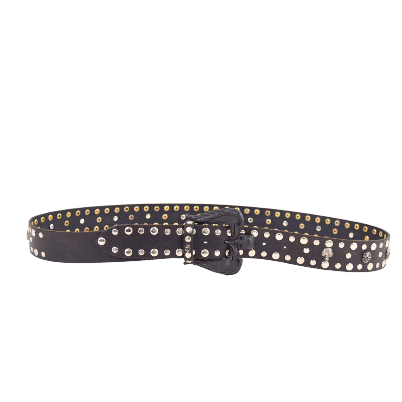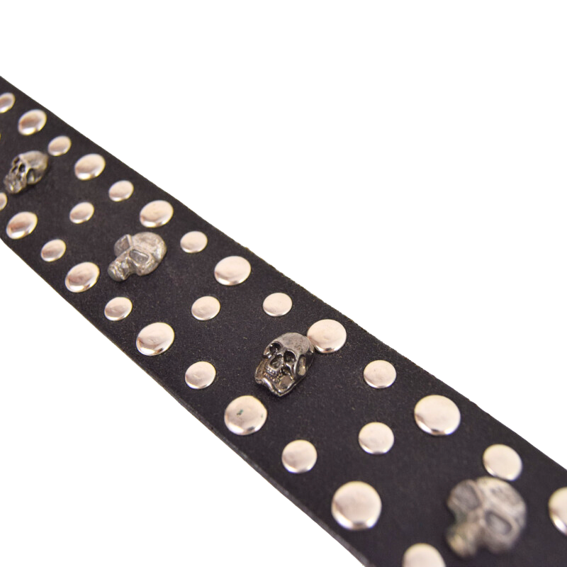 Realizzata al 100% in pelle effetto invecchiato. Borchiatab interamente a mano con rivetti color argento e borchie a forma di teschio.