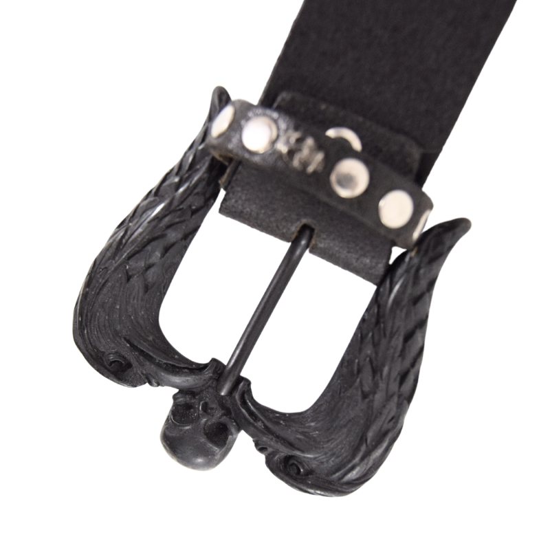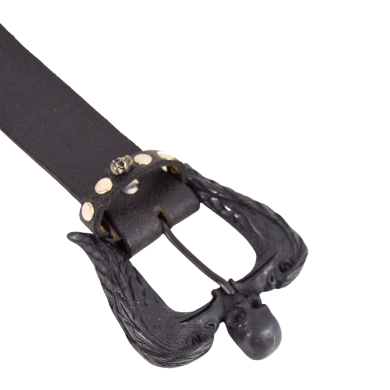 Altezza 4cm. Fibbia, a forma di teschio alato, in zamak galvanica canna di fucile opaca.