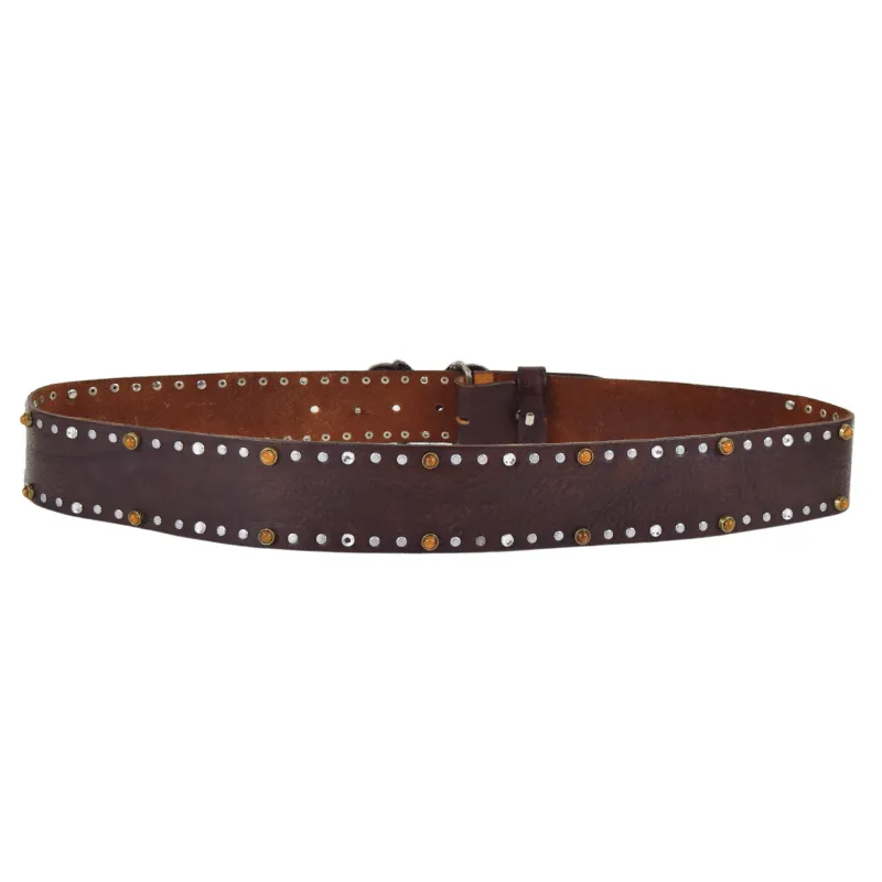 Borchiata a mano con rivetti galvanica color argento e simil pietre color ambra.