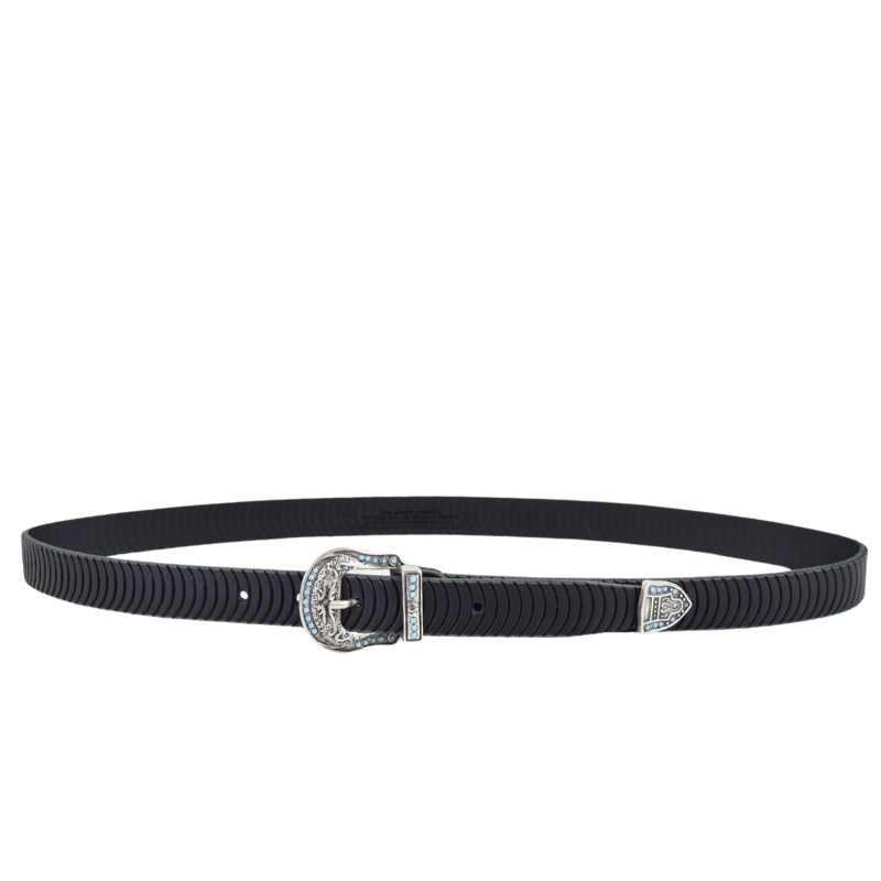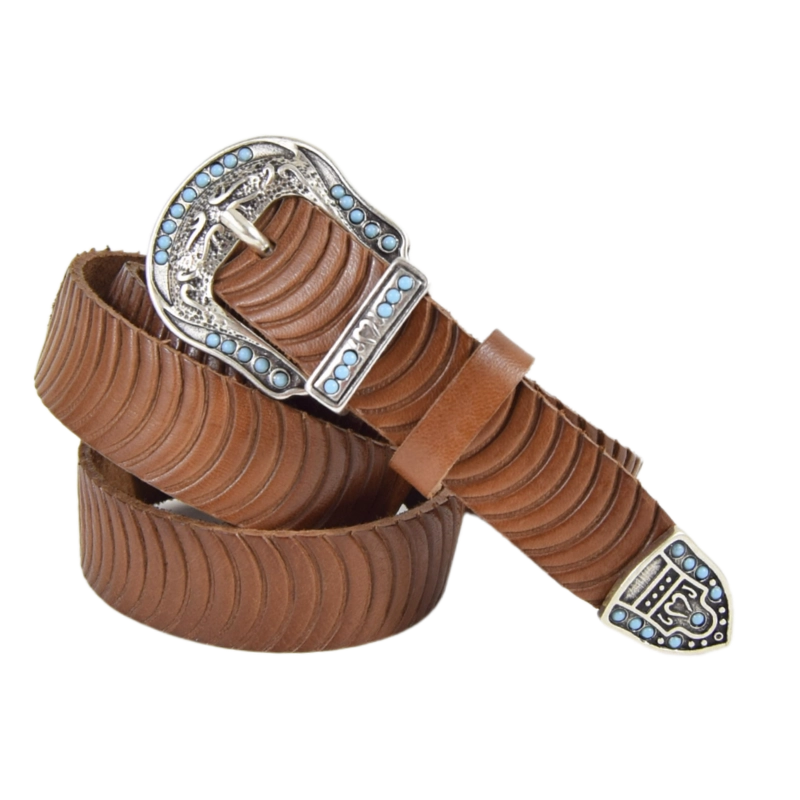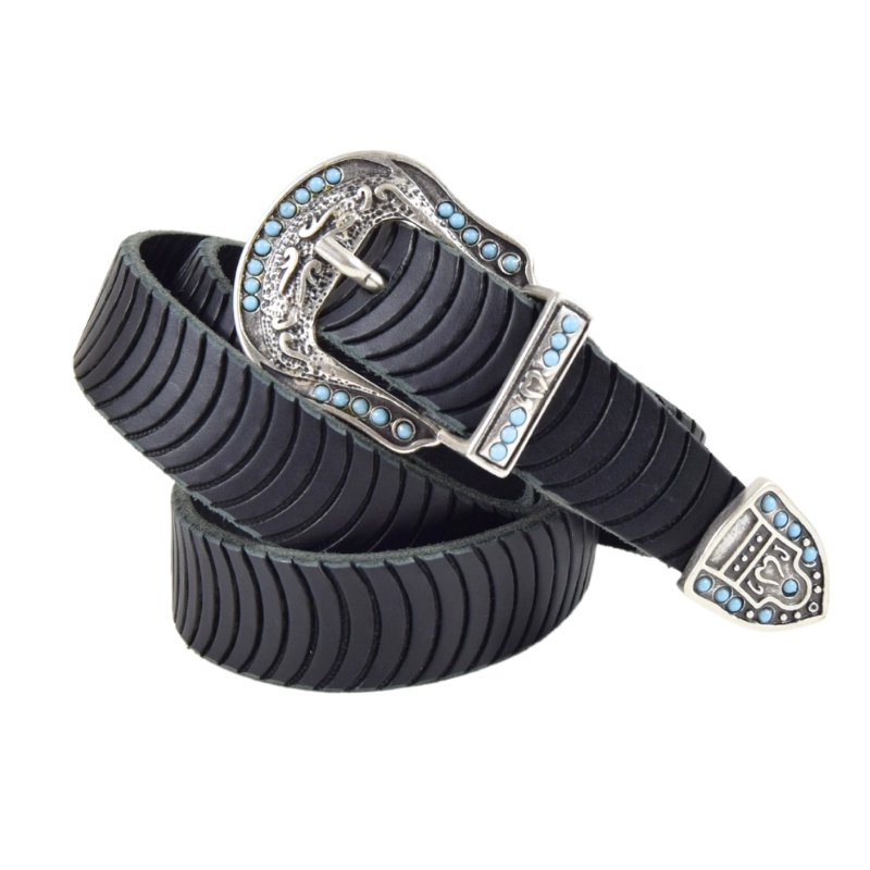Altezza 2,5cm. Fibbia, passante e puntale in zamak galvanica argento invecchiato con simil pietre turchesi.