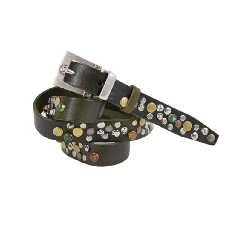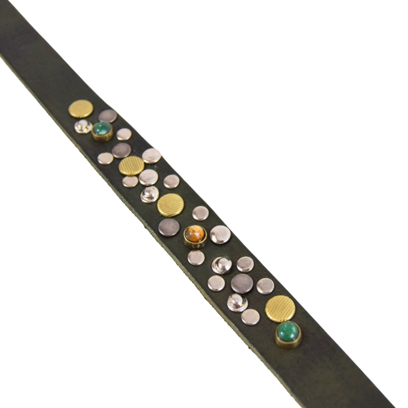 Altezza 2cm. Fibbia in zamak galvanica argento invecchiato. Borchiata interamente a mano con rivetti misti e simil pietre color ambra e verde.