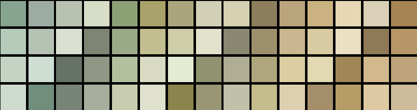 Tinte: selezione dalla mazzetta 365 A YEAR OF COLORS – Gamma British1 (Var.01-30): Tinte nelle varie gradazioni di verde.