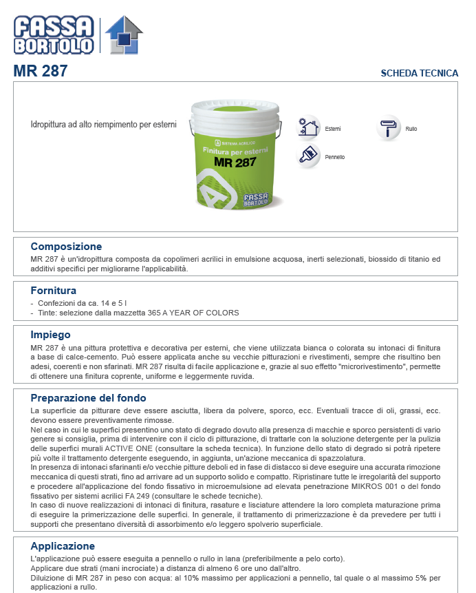 MR 287 è una pittura protettiva e decorativa per esterni, che viene utilizzata bianca o colorata su intonaci di finitura a base di calce-cemento. Può essere applicata anche su vecchie pitturazioni e rivestimenti, sempre che risultino ben adesi, coerenti e non sfarinati. MR 287 risulta di facile applicazione e, grazie al suo effetto “micro-rivestimento”, permette di ottenere una finitura coprente, uniforme e leggermente ruvida