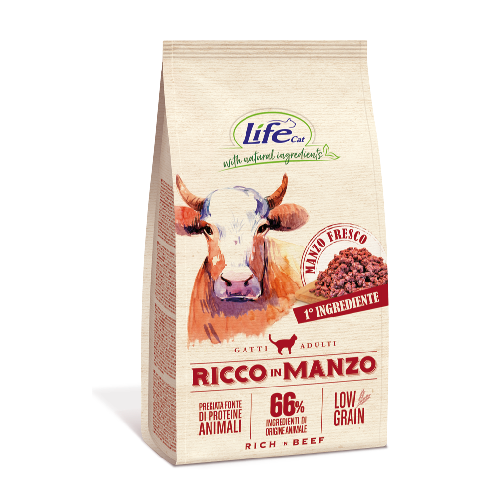 Manzo fresco* (25%), Pollo disidratato (25%), Farina di riso* ( 19,5%), Farina di riso integrale* (8,2%), Suino disidratato (5,3%), Grasso di pollo (4,9%), Polpa di barbabietola, Proteine disidratate di suino (3,4%), Proteine animali idrolizzate (2,46%), Sostanze minerali, Mannano – oligosaccaridi* (0,1%), Inulina di cicoria – fonte di FOS (0,1%), Yucca schidigera* (0,01%).