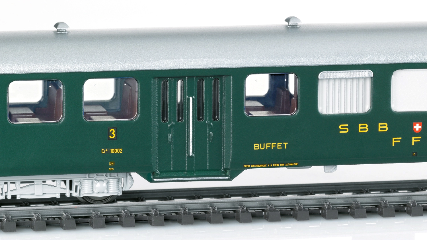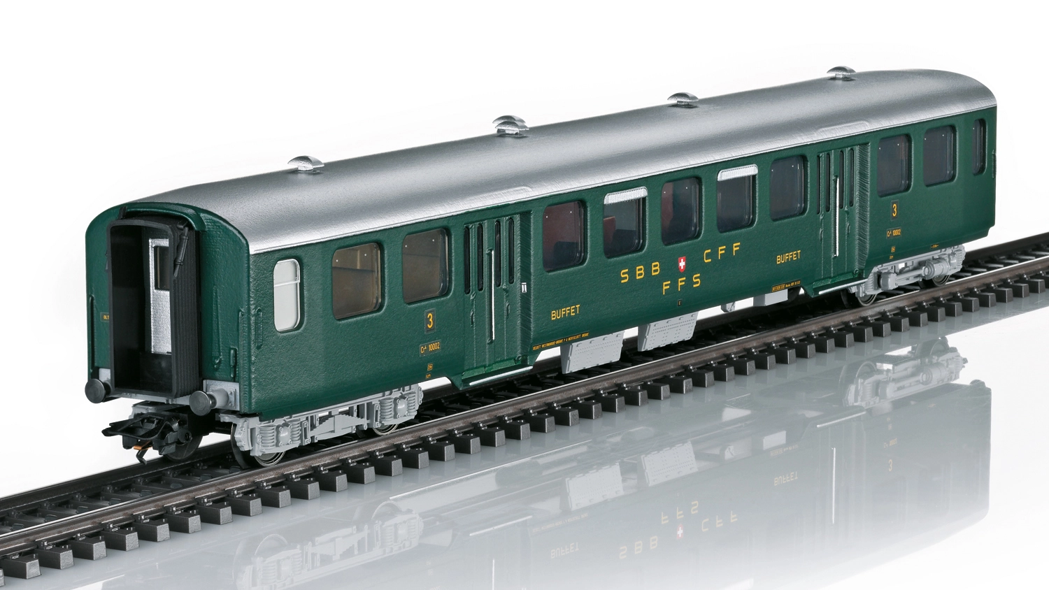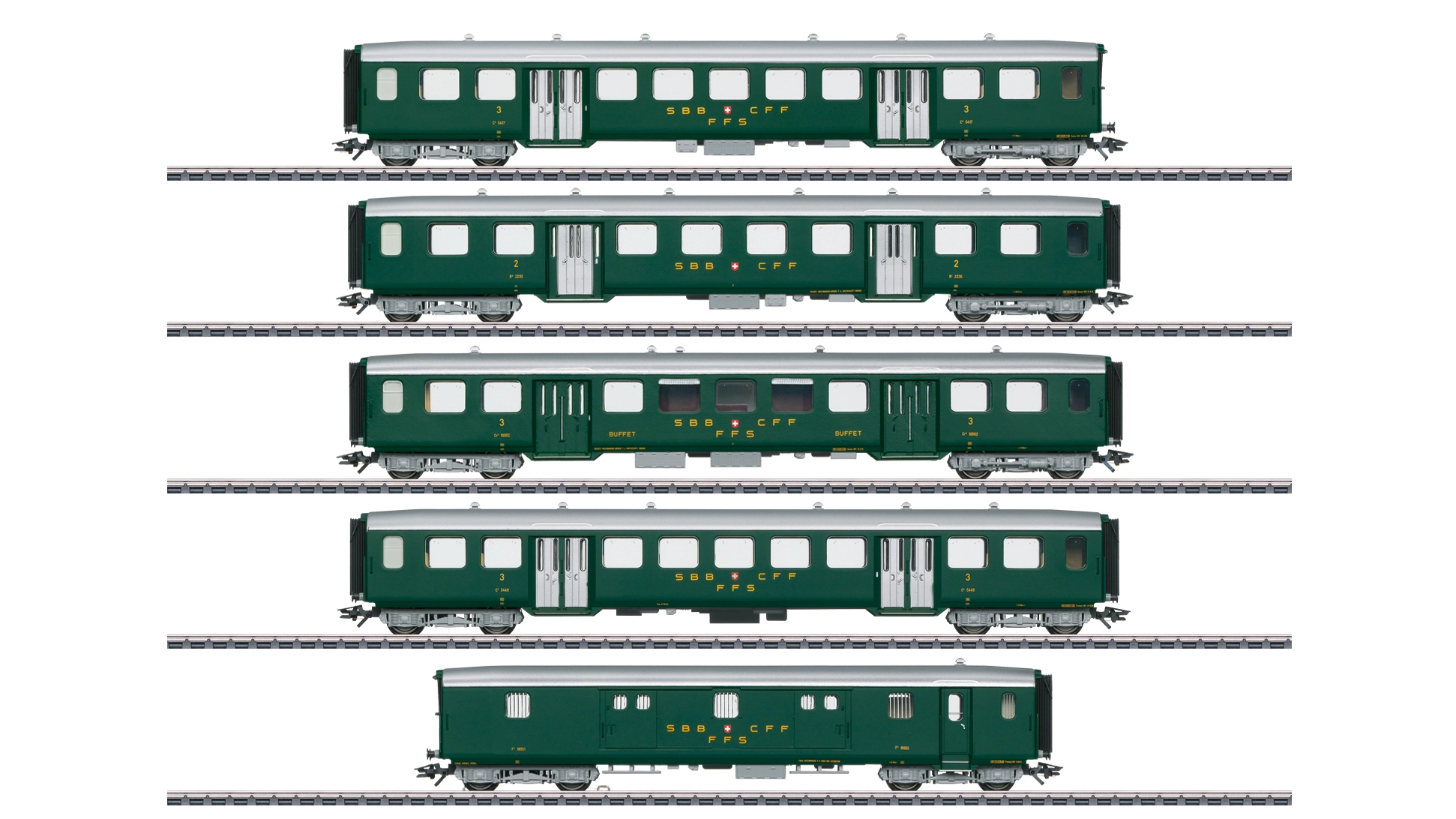 Set di 5 carrozze d’acciaio leggere delle Ferrovie Federali Svizzere (SBB-CFF-FFS) impiegate sui treni rapidi sulla tratta Ginevra-Berna-Zurigo, composto da 2 carrozze C4 di 3° classe, 1 carrozza B4 di 2° classe, 1 carrozza Cr4 di 3° classe con reparto buffet ed 1 bagagliaio F4, in livrea verde abete, epoca III.