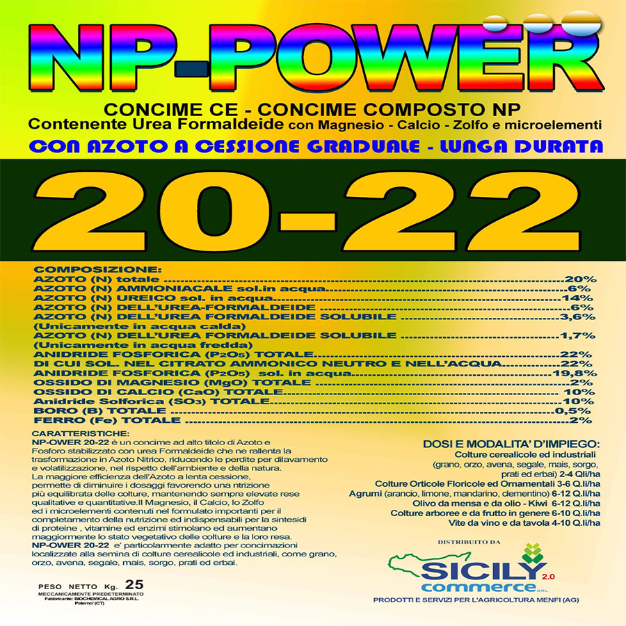 Np-power 20-22 è un concime ad alto titolo di azoto e fosforo stabilizzato con urea Fosforo stabilizzato con urea Formaldeide che ne rallenta la trasformazione in Azoto Nitrico, riducendo le perdite per dilavamento evolatilizzazione, nel rispetto dell’ambiente e della natura.