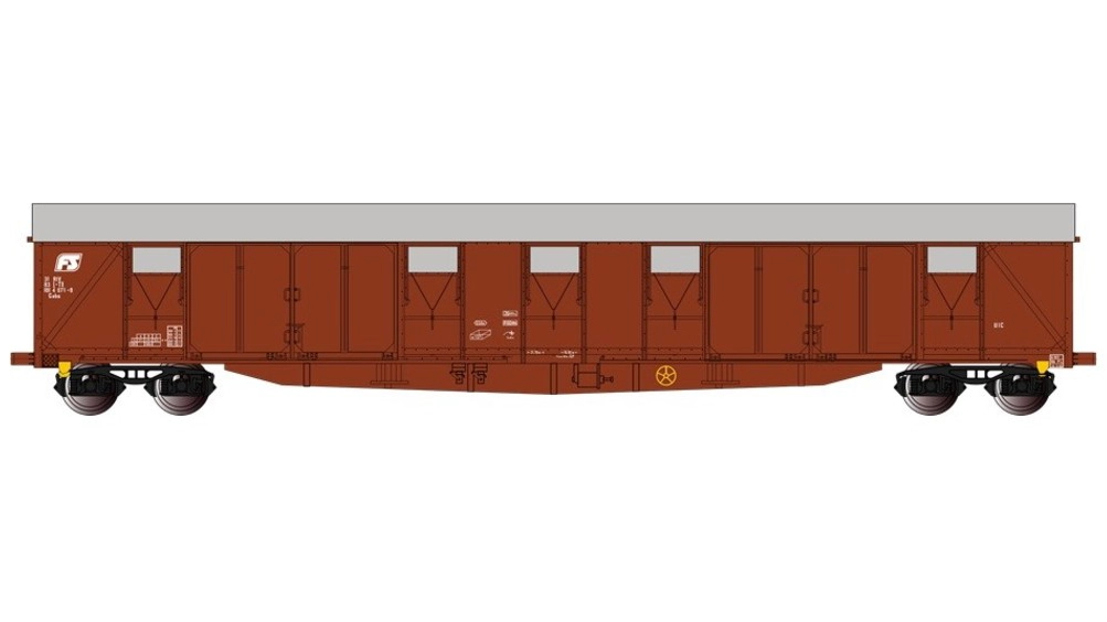 Carro chiuso Tipo Gabs di Trenitalia (TI), con porte in legno, tetto in alluminio e logo a losanga, epoca VI.