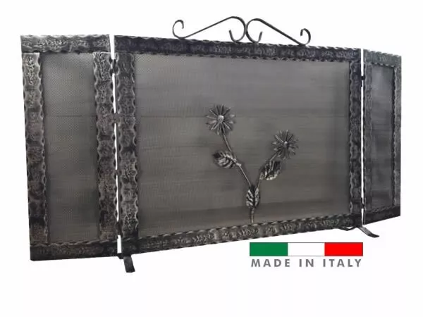 Parascintille margherita in ferro battuto massiccio, ideale per un gran camino, composto da un panello con 2 piedini e 2 antine laterali pieghevoli.