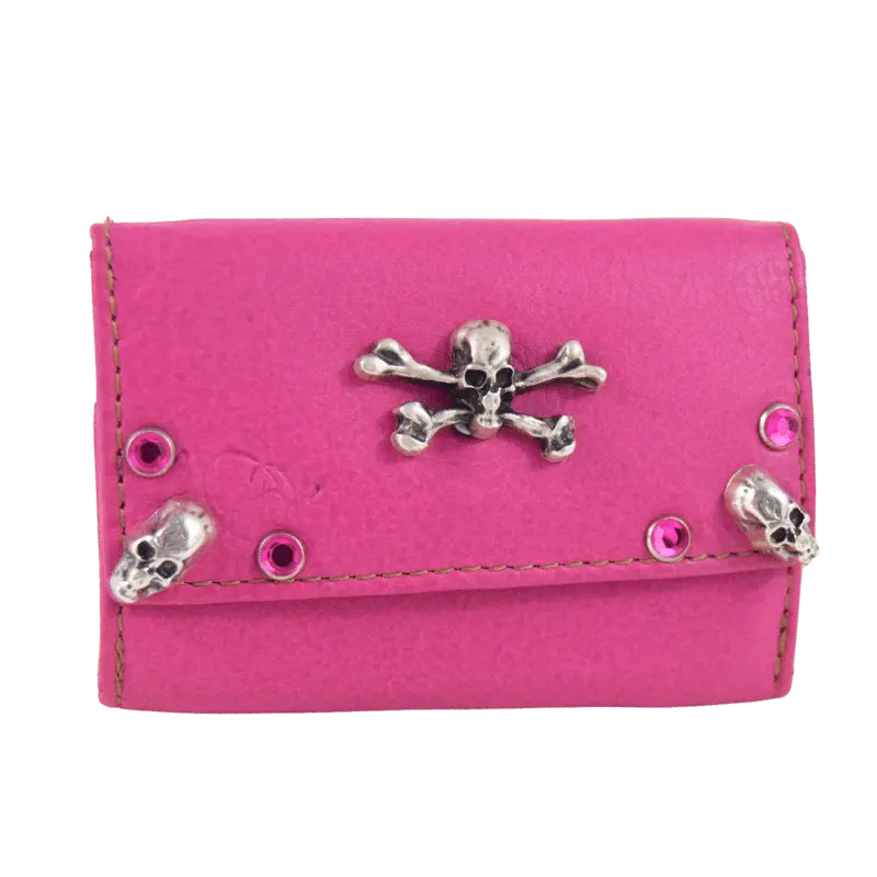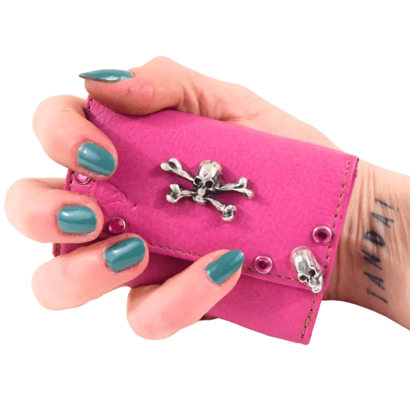 É interamente borchiato a mano, con strass fucsia e borchie a forma di teschio.