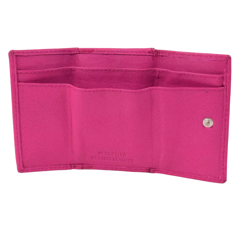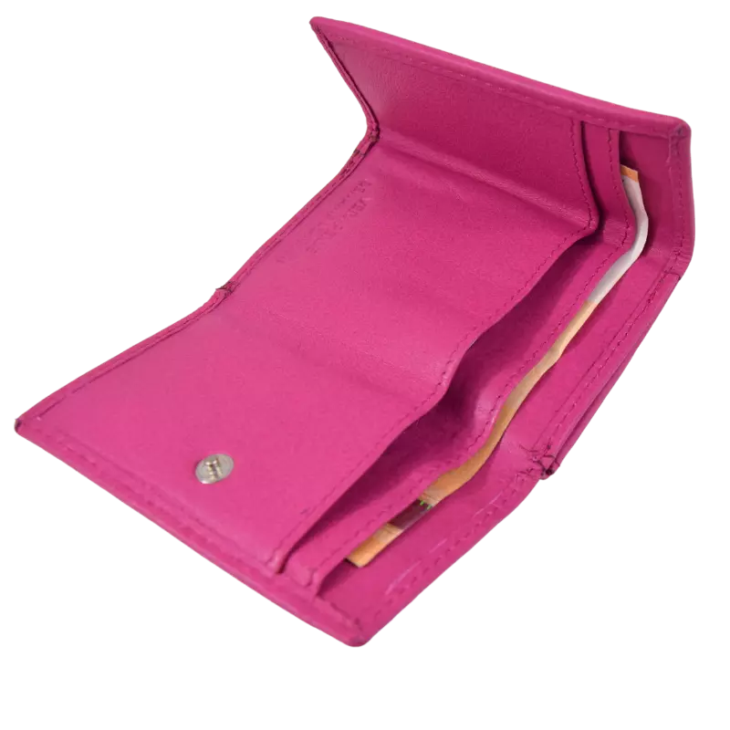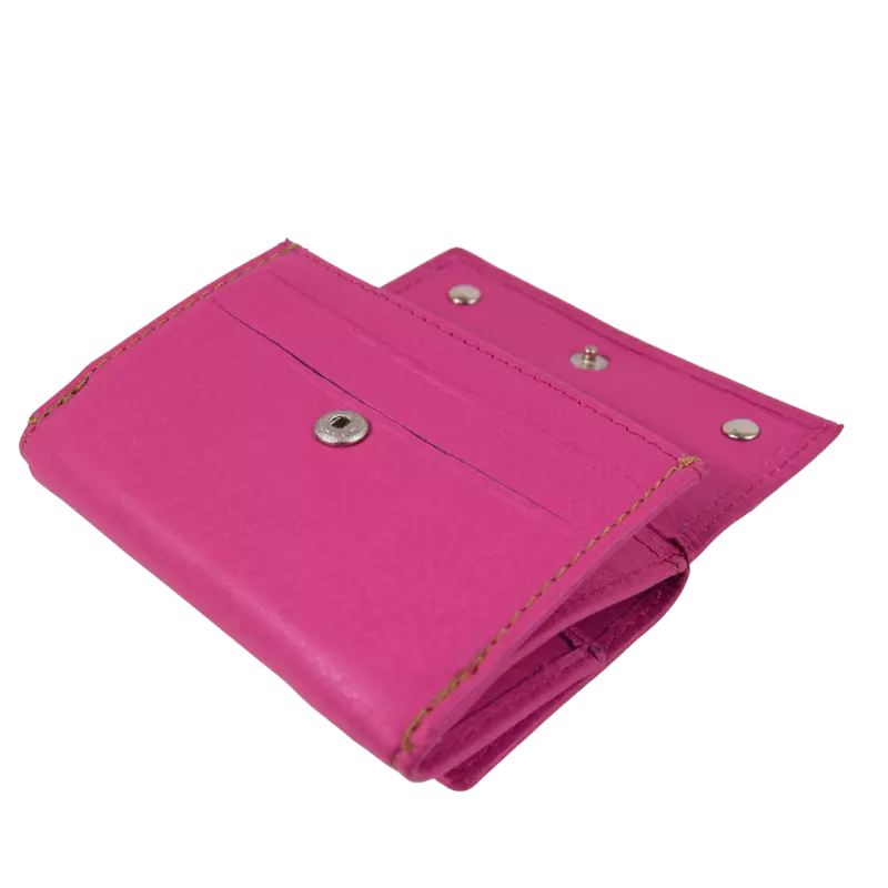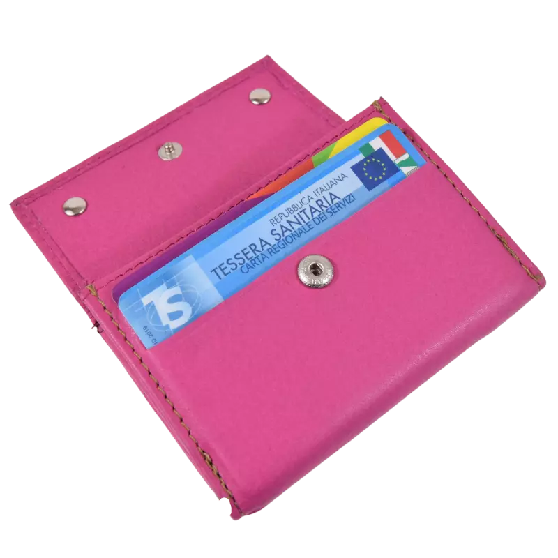 Il portafoglio Minidouble Calavi, realizzato in vera pelle, è composto da 2 tasche porta tessere e documenti, doppio scomparto per le banconote, e taschino classico con bottone automatico per le monete.