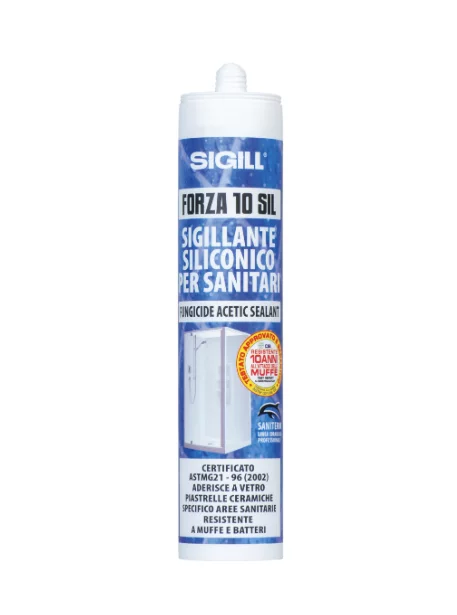 Sigillante siliconico acetico speciale sanitario, di altissima qualità, ad elevata resistenza alle muffe.