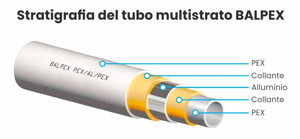 Tubo multistrato: Strato esterno in PE-Xb + Collante + Strato intermedio in alluminio + collante + Strato interno in PE-Xb