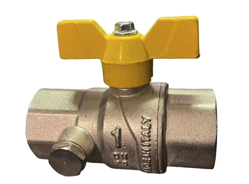 Valvola a sfera per gas da 1″, attacco femmina – femmina in ottone nichelata con presa di pressione da 1/4, maniglia a farfalla in alluminio verniciato giallo.