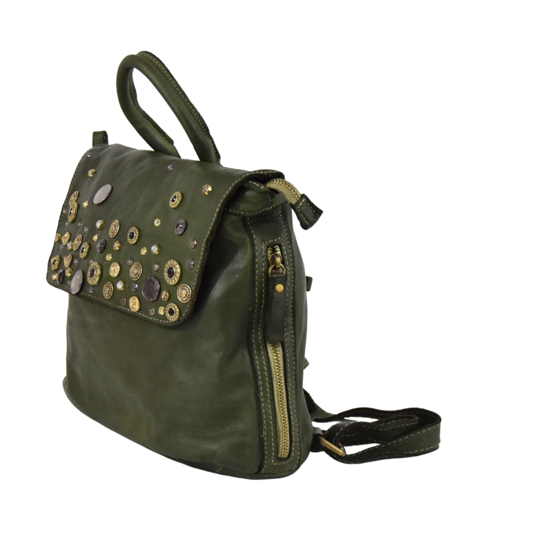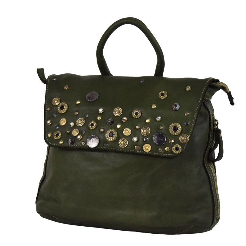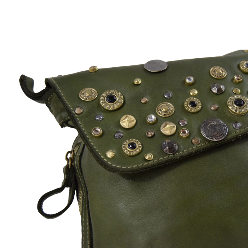 È interamente borchiato in maniera artigianale, per tanto la disposizione delle borchie può variare leggermente dal modello in foto, ma ciò non è da considerarsi un errore, ma una peculiarità del lavoro artigianale, che rende ogni accessorio unico.