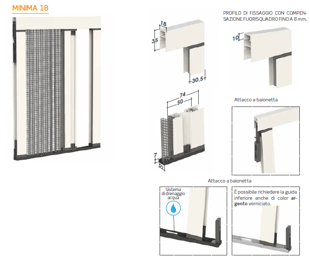 Note: profondità di 18 mm. Barra maniglia inserita nella guida inferiore, con stabilità durante l’azionamento e massima fluidità nello scorrimento. La guida inferiore è alta solo 7 mm ed è provvista di asole per il drenaggio dell’acqua, che ne evitano il fastidioso deposito. L’installazione è veloce, con il minimo sforzo e pochissimi fori: il profilo laterale aderisce alla parete agganciandosi alla guida inferiore ed alla guida superiore tramite un attacco a baionetta.
